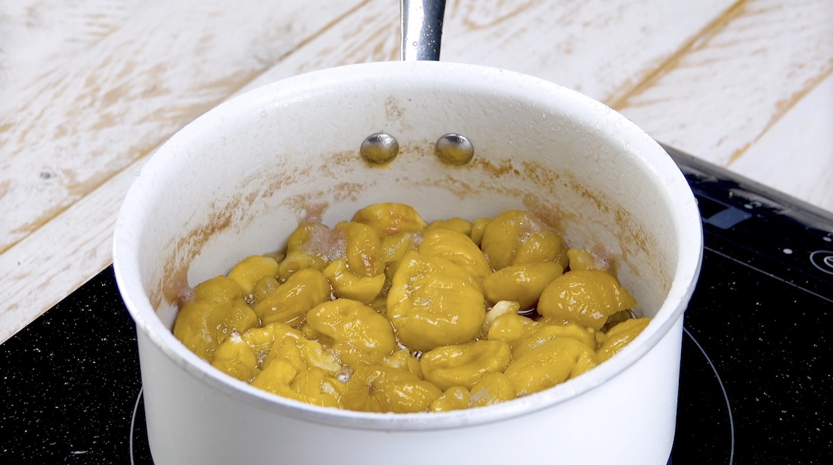 3.) Koche das Wasser mit dem Zucker auf. Gib dann die geschälten Maronen hinein und koche sie für 10 Minuten, ohne einen Deckel auf den Topf zu setzen.