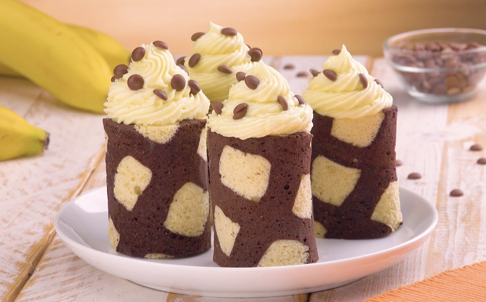 Als wahres Multitalent unter den Kuchenteigen hat sich Biskuit etabliert. Schichten und rollen, riesige Torten oder handliche Leckerbissen: Alles geht mit ihm. Auch die wunderschönen, cremegefüllten Röllchen, die wir jetzt vorstellen, bedienen sich dieses Teigs. Sich in die Ergebnisse zu verlieben, wird ein Leichtes, denn sie kommen gleich mit doppeltem Clou daher: mit gemustertem Teig und Bananenfüllung. Hier findest du das Rezept für die Röllchen mit Banane und Schokolade.
