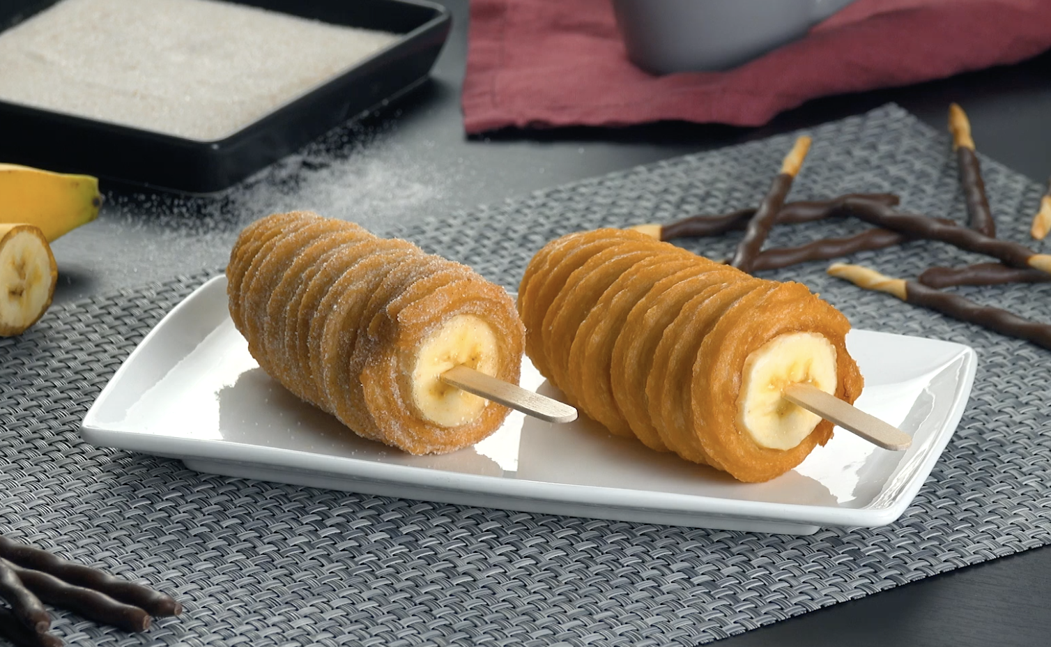 Wer schon einmal in Spanien war, weiß, wie beliebt Churros dort sind. Dieser köstliche, süße Snack ist ein Fettgebäck, welches in Zimt und Zucker gewendet wird und dir alle Sinne raubt. Am besten verzehrst du sie mit Schokoladensoße. Eine noch bessere Variante findest du bei uns: Hier trifft Banane auf Churros. Wir spießen das beliebteste Obst der Deutschen auf einen Eisstiel und kleiden es in Brandteig. Dann frittieren wir den Bananen-Churro und verfeinern ihn mit Zimt und Zucker. Zu guter Letzt tunken wir das gute Stück noch in Schokoladensoße. Na, bekommst du schon Schnappatmung? Hier findest du das Rezept für die Bananen-Churros.