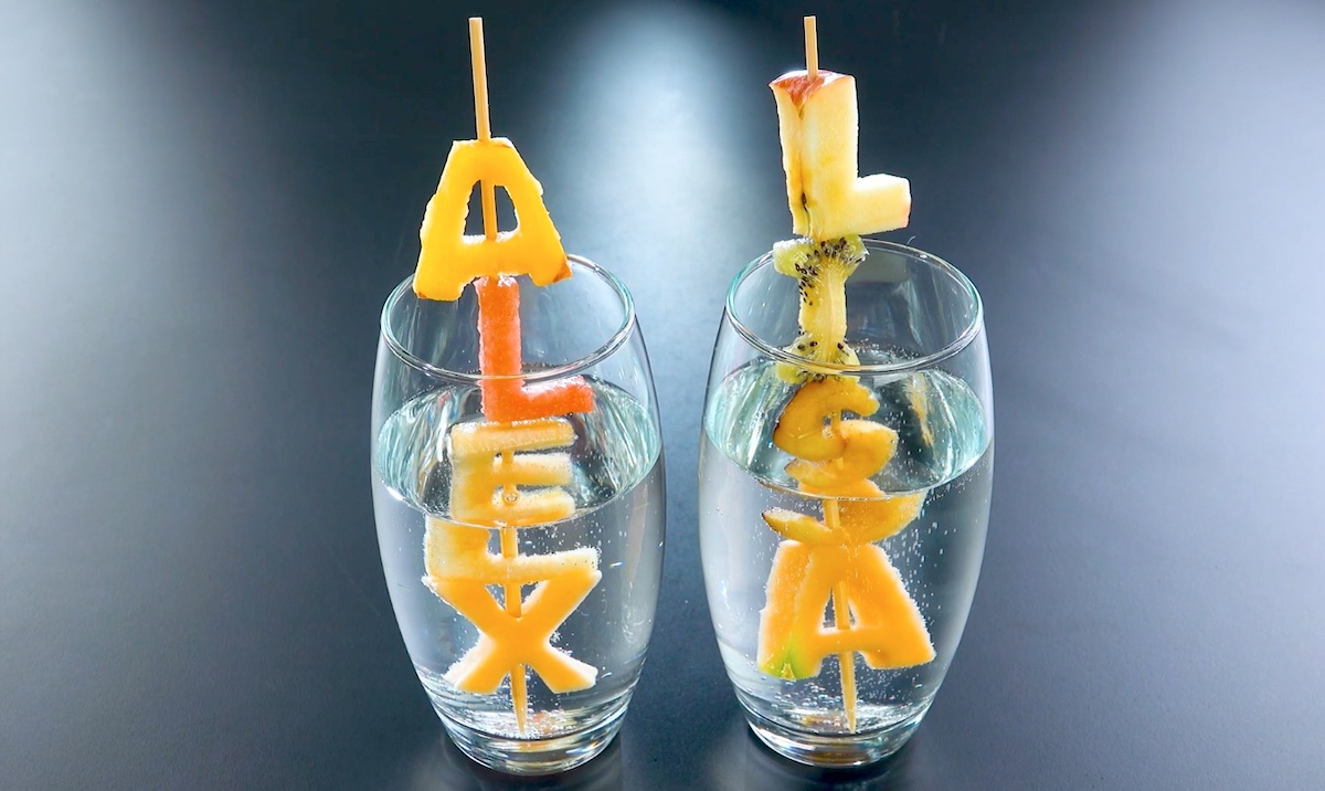 Schneide das Obst in Scheiben und stich die gewünschten Buchstaben aus. Schiebe die Buchstaben dann vorsichtig auf einen Holzspieß.