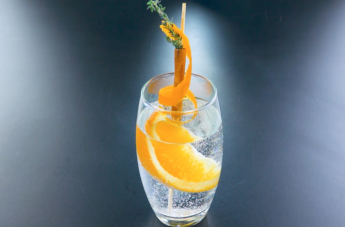 Schneide von der Orange ein langes Stück Schale ab. Schneide aus der Orange zudem einen Spalt heraus. Spieße den Orangenspalt, gefolgt von einem Ende der Orangenschale, auf einen Holzspieß, schiebe dann die Zimtstange über den Spieß und umwickle diese mit der Orangenschale, deren anderes Ende oben auf den Spieß gesteckt wird. Stecke zum Abschluss einen Thymianzweig in die Zimtstange.