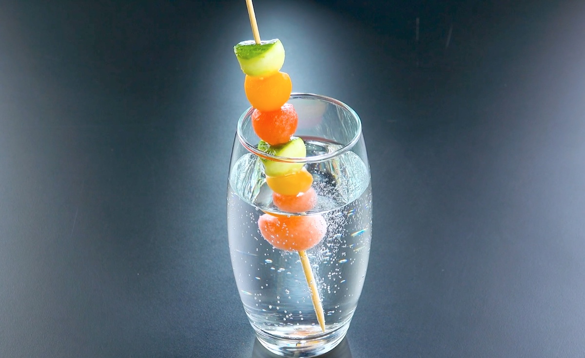 Schneide aus dem Obst und der Gurke je zwei Kugeln aus und schiebe diese auf einen Holzspieß.