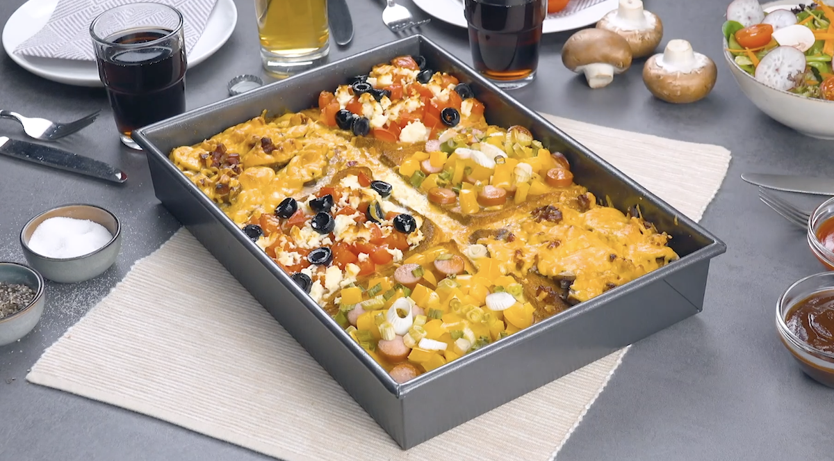 So einfach kann es sein, viele Toasts auf einen Schlag zu toasten: Stecke 12 Scheiben Toastbrot hochkant in einen Backrost und röste sie für nur 5 Minuten im Ofen. Im Handumdrehen sind alle gleichzeitig fertig und du kannst sie zu leckeren Sandwiches weiterverarbeiten. Lege die gerösteten Brotscheiben in ein tiefes Backblech, übergieße sie mit Ei und fange an, sie mit verschiedenen Toppings wie Tomaten, Champignons, Bacon und Käse zu belegen. Hier findest du die Rezepte für die einzelnen Sandwiches.