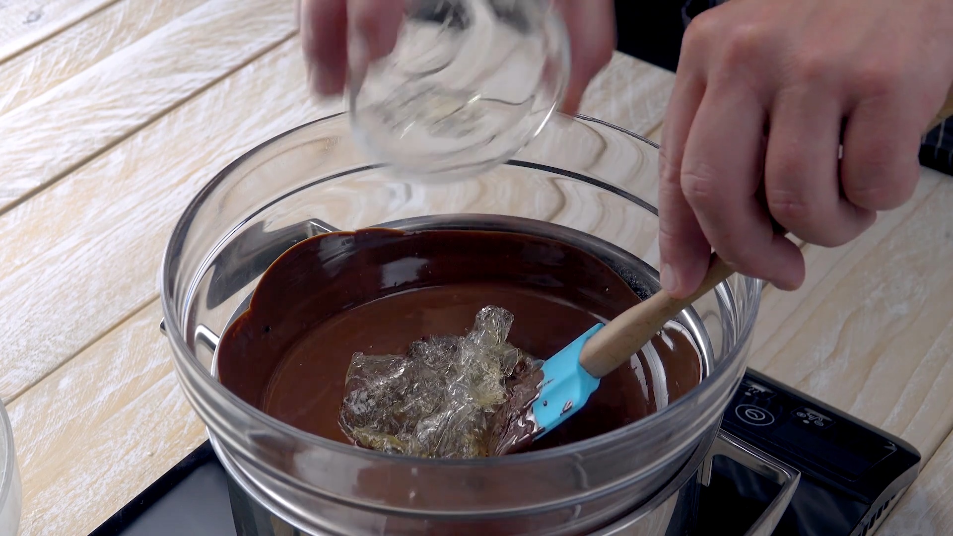 4.) Bringe zwischenzeitlich die dunkle Schokolade in einem Wasserbad zum Schmelzen und rühre schließlich zwei eingeweichte Gelatineblätter unter. Nimm die Schüssel vom Wasserbad und arbeite 200 Gramm Schlagsahne unter.