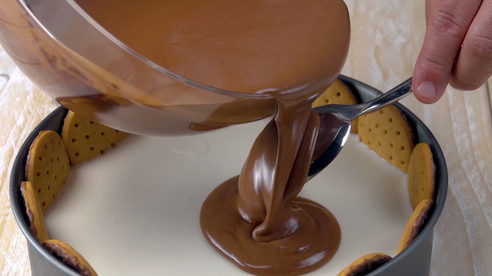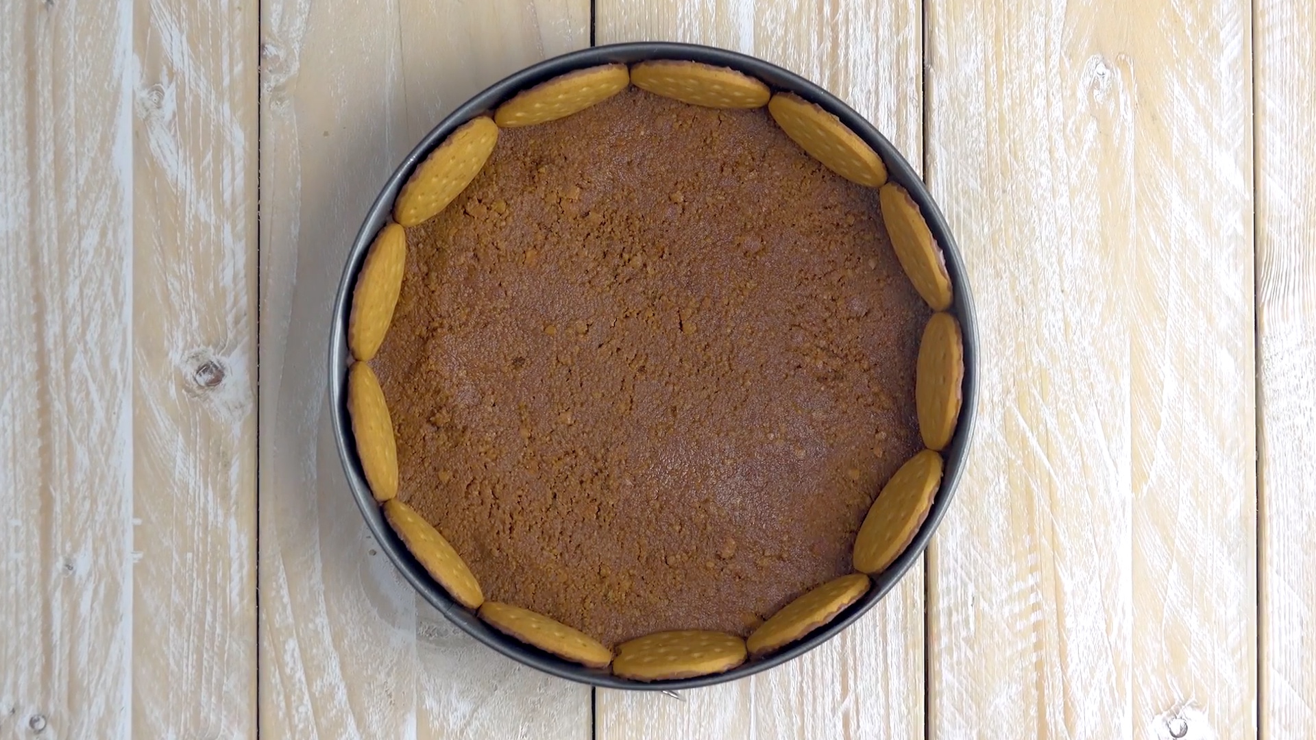 1.) Fülle 200 Gramm Kekse in einen Gefrierbeutel um und zerkleinere sie mit einem Nudelholz fein zu Krümeln. Vermenge die Krümel mit Butter und presse die Masse in einer mit Backpapier ausgelegten Springform glatt. Nutze die übrigen Kekse, um den Rand auszulegen. Drücke die Kekse in den weichen Boden und drehe die Schokoladenseite nach außen (direkt an die Springform). Nun stellst du den Boden zum Aushärten kalt.