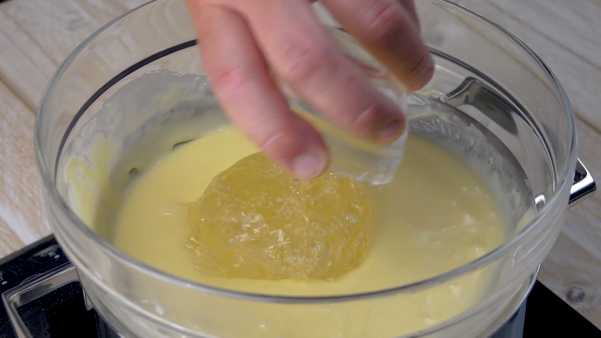 2.) Gib weiße Schokolade und Kondensmilch in ein Wasserbad und löse die Schokolade auf. Dann rührst du sechs eingeweichte Blätter Gelatine ein, bis sie vollständig aufgelöst sind, und nimmst die Schüssel vom Wasserbad. Rühre schließlich 300 Gramm Schlagsahne portionsweise unter.