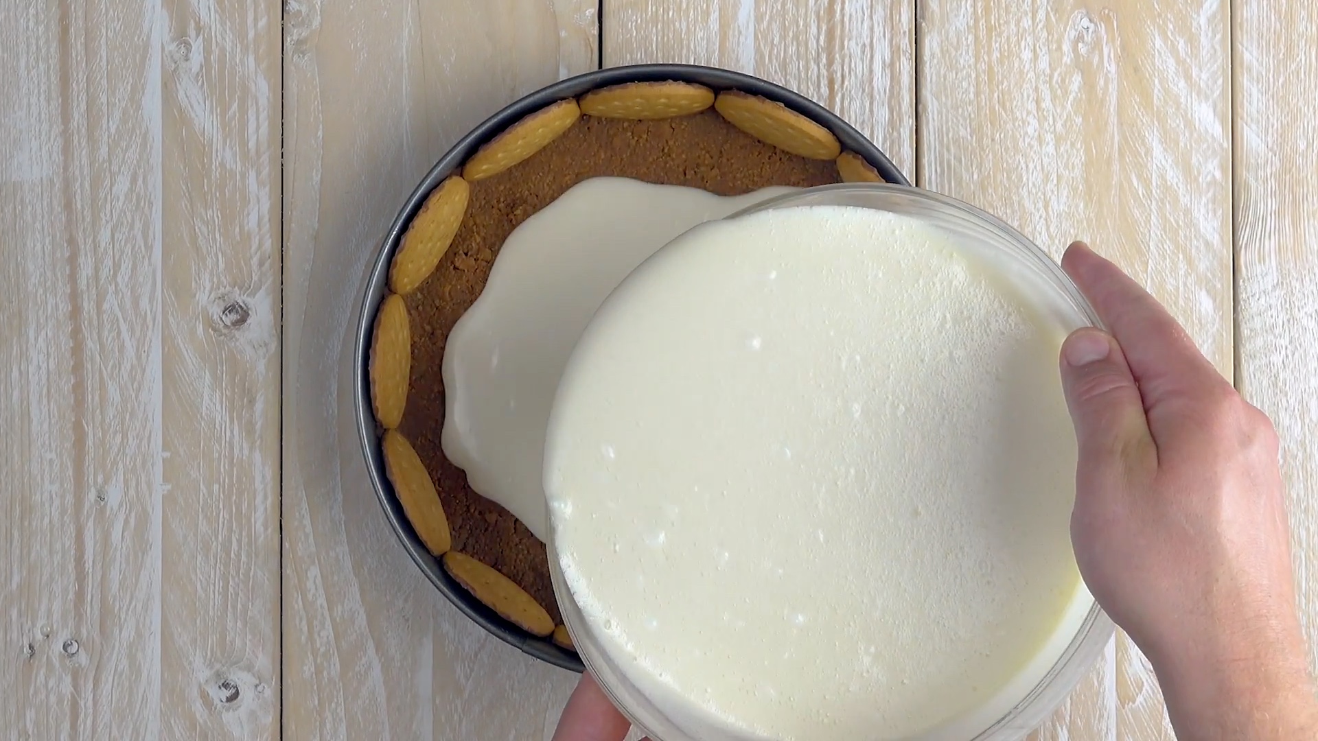 3.) Fülle die Hälfte der hellen Creme auf den gekühlten Keksboden und stelle die Springform erneut kalt.