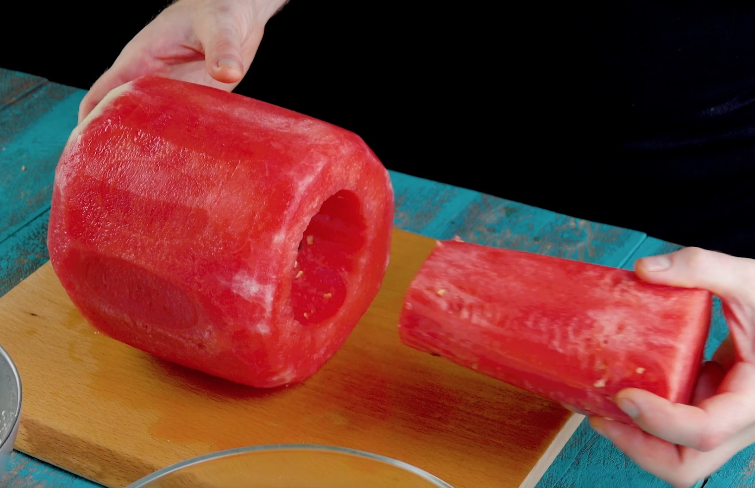 Tupfe die ausgehöhlte Melone außen mit einem Küchentuch und schneide vom herausgezogenen Kolben zwei dicke Scheiben ab. Gib eine der Scheiben als Boden in die Mitte der hohlen Melone.