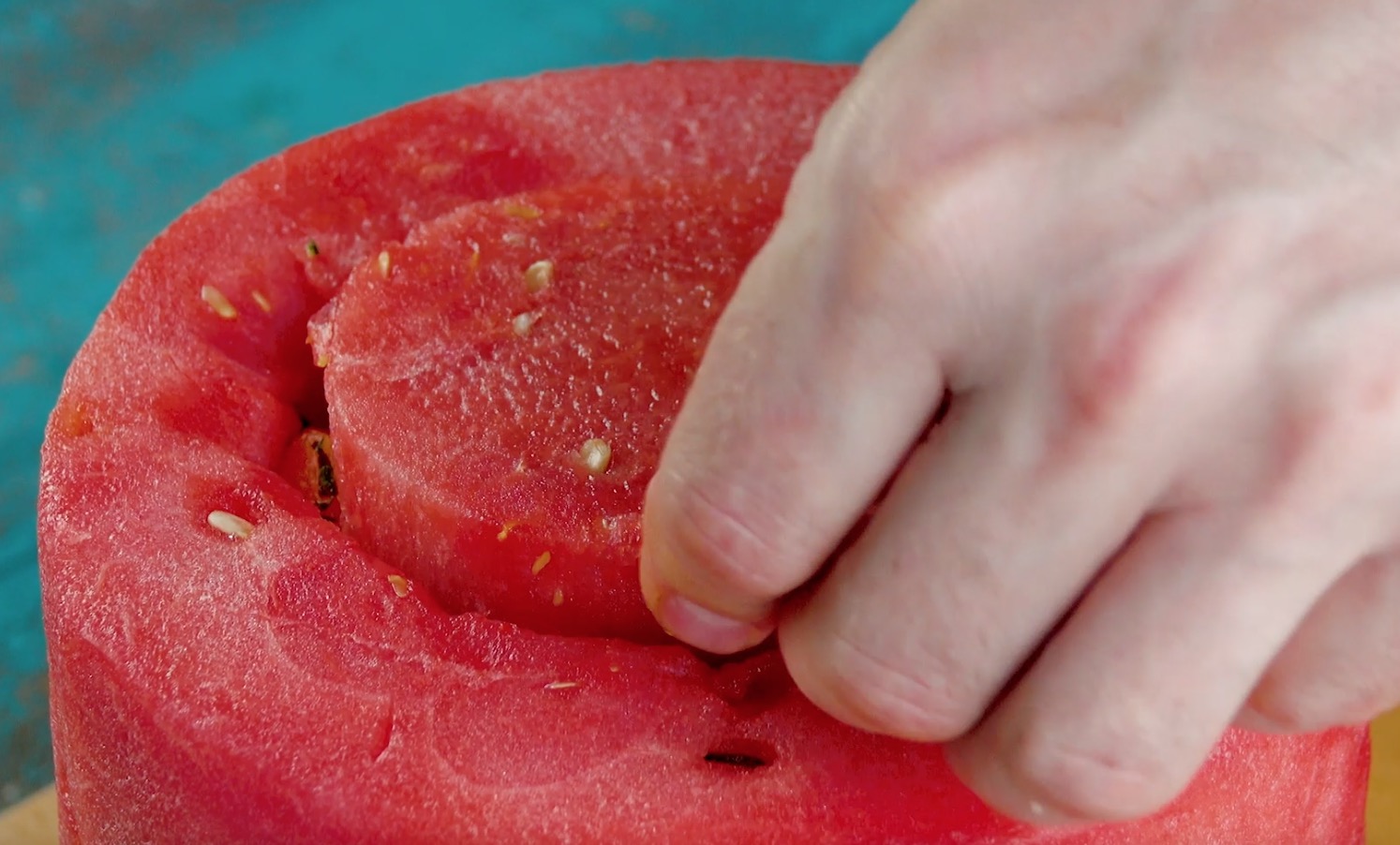 5.) Fülle das Wassermelonengehäuse nun mit der Melonenkugelmischung und setze als Deckel die Wassermelonenscheibe, die du noch übrig hast, darauf.