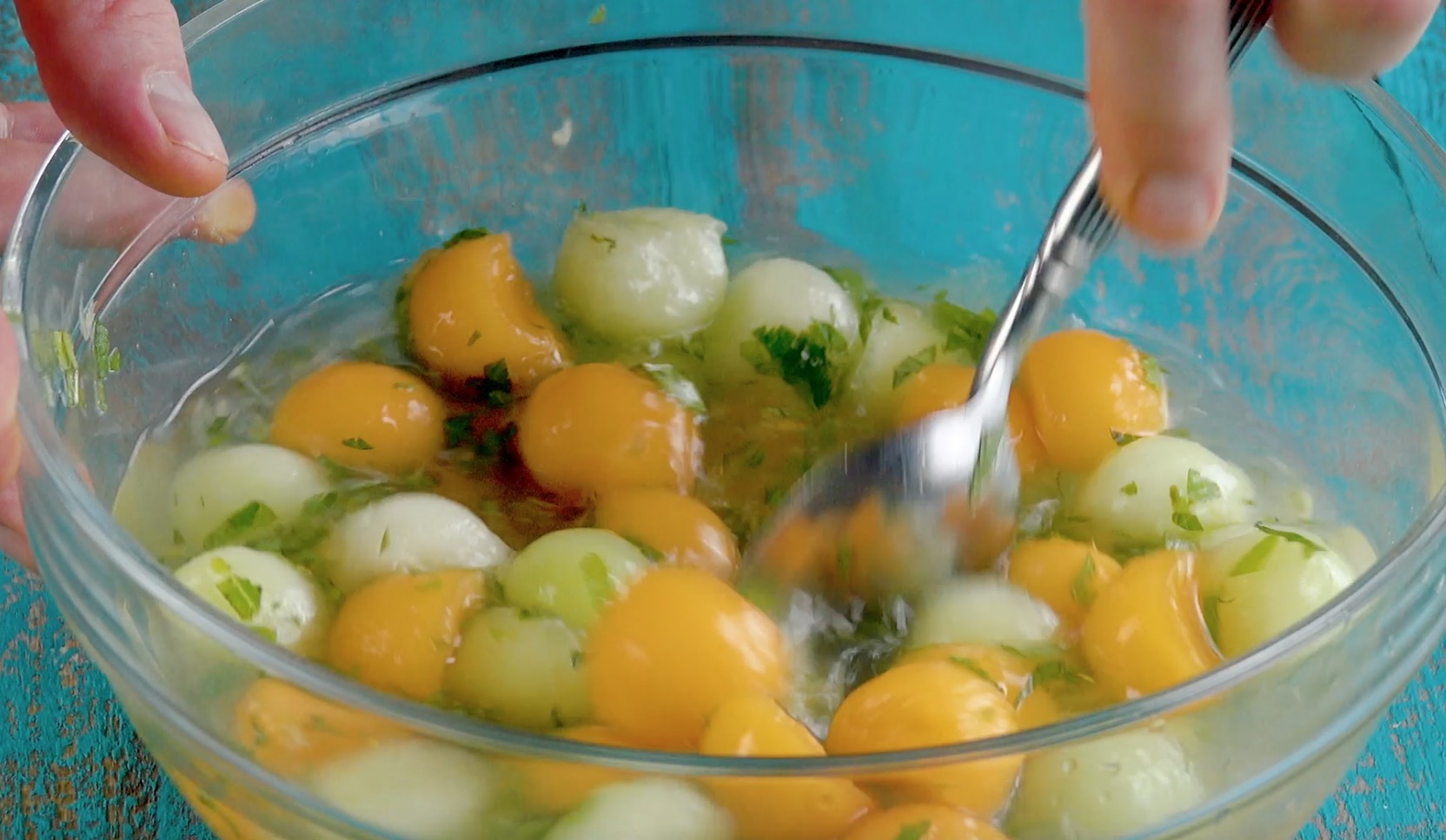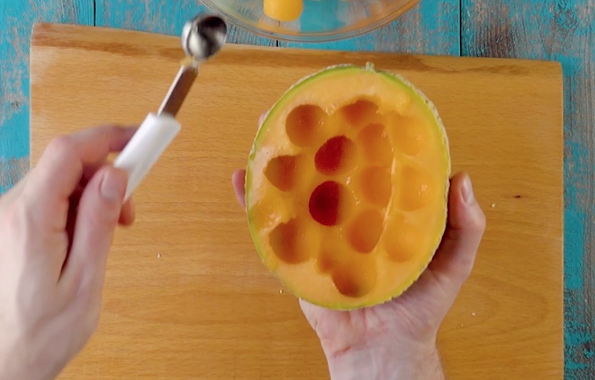 Verfahre ebenso mit der Cantaloupe-Melone und gib die ausgestochenen Kugeln zu denen der Honigmelone.