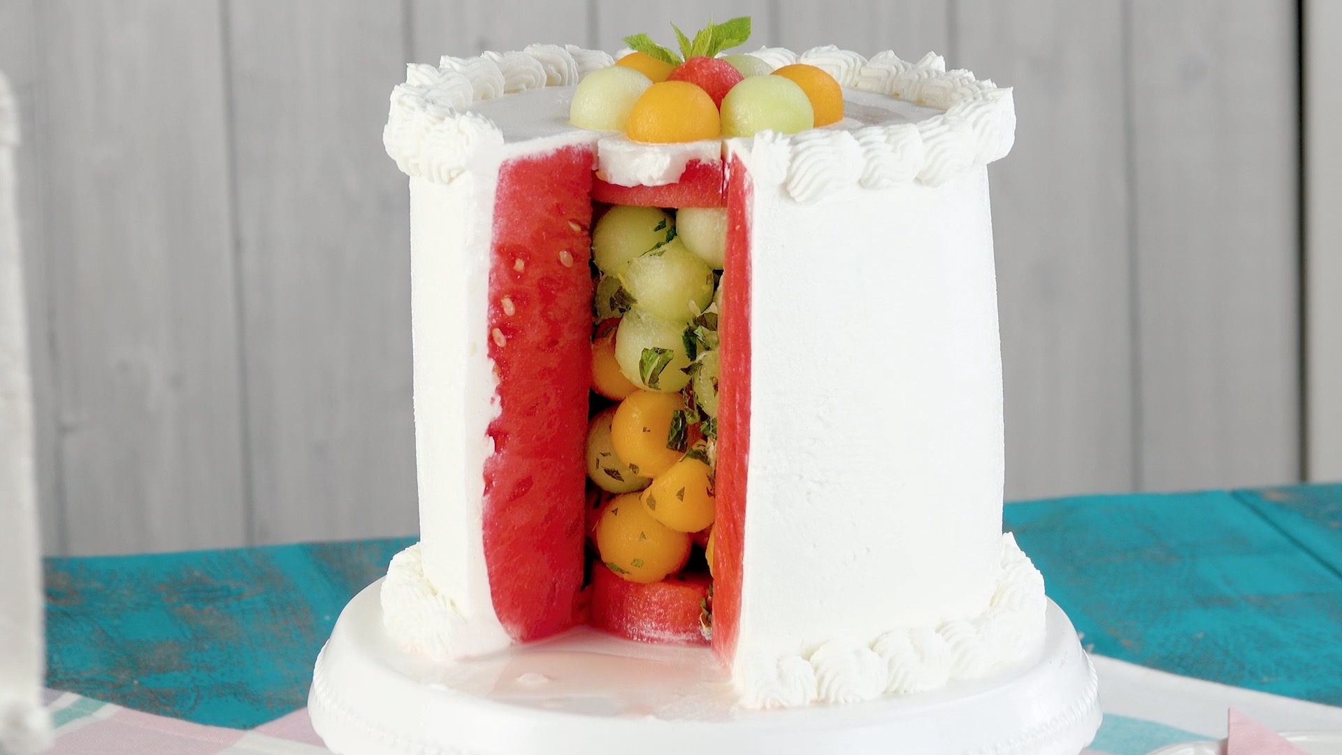 6.) Streiche nun einen Großteil der Creme mit einem Spatel seitlich und oben auf der Wassermelone glatt.