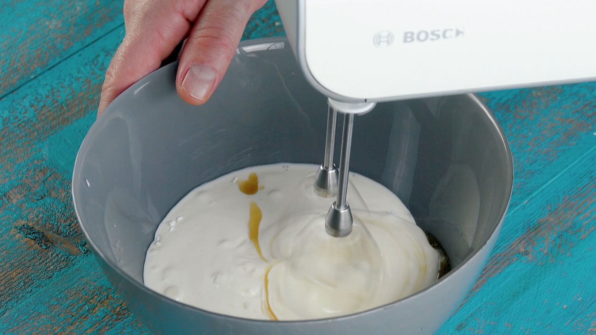 3.) Mische für die Creme nun Sahne, Puderzucker und Vanillearoma in einer Schüssel und rühre die Zutaten mit einem Handrührgerät schaumig.