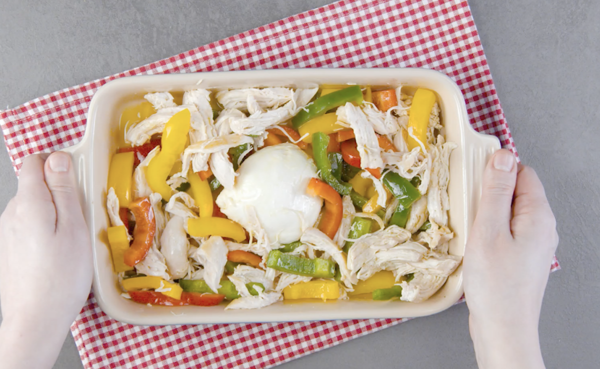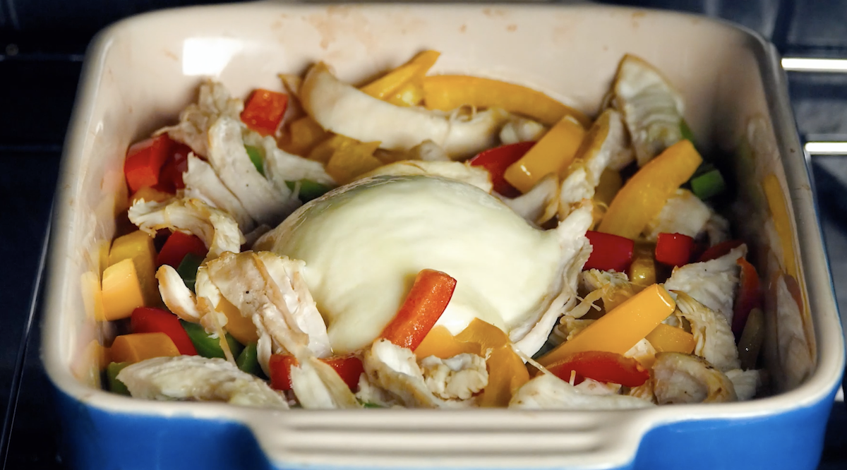 2.1 Lege einen Mozzarella in eine Auflaufform und gib rundherum in Streifen geschnittene Paprika und bereits gares, gezupftes Chicken hinzu.