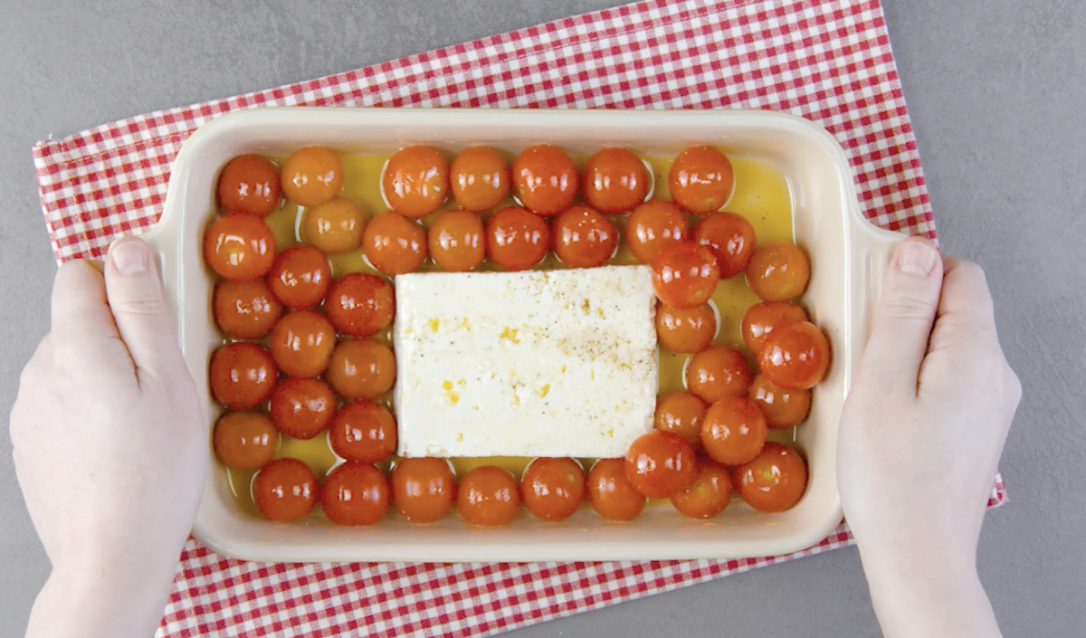 1.1 Gib Cherrytomaten und Feta in eine Auflaufform. Benetze alles mit Olivenöl und würze mit Salz und Pfeffer. Wichtig ist, dass der Feta in der Mitte der Auflaufform liegt. Schiebe die Auflaufform dann bei 200 °C Ober- und Unterhitze für 30 Minuten in den Ofen.