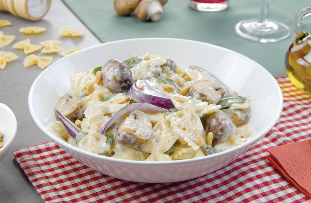 3.2 Hole die Auflaufform aus dem Ofen und füge Spinat und Pinienkerne hinzu. Vermische alles miteinander und hebe zum Schluss die Farfalle unter.