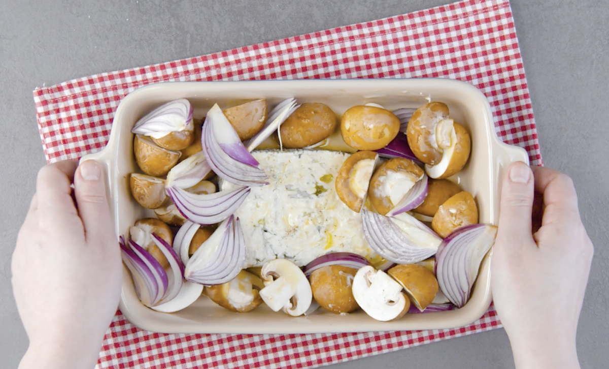 3.1 Lege den Gorgonzola in eine Auflaufform und verteile ringsherum geschnittene Champignons und die Zwiebel. Benetze alles mit Olivenöl und würze mit Salz und Pfeffer. Schiebe die Form bei 200 °C Ober- und Unterhitze für etwa 25 Minuten in den Ofen. Bringe währenddessen die Nudeln zum Kochen.