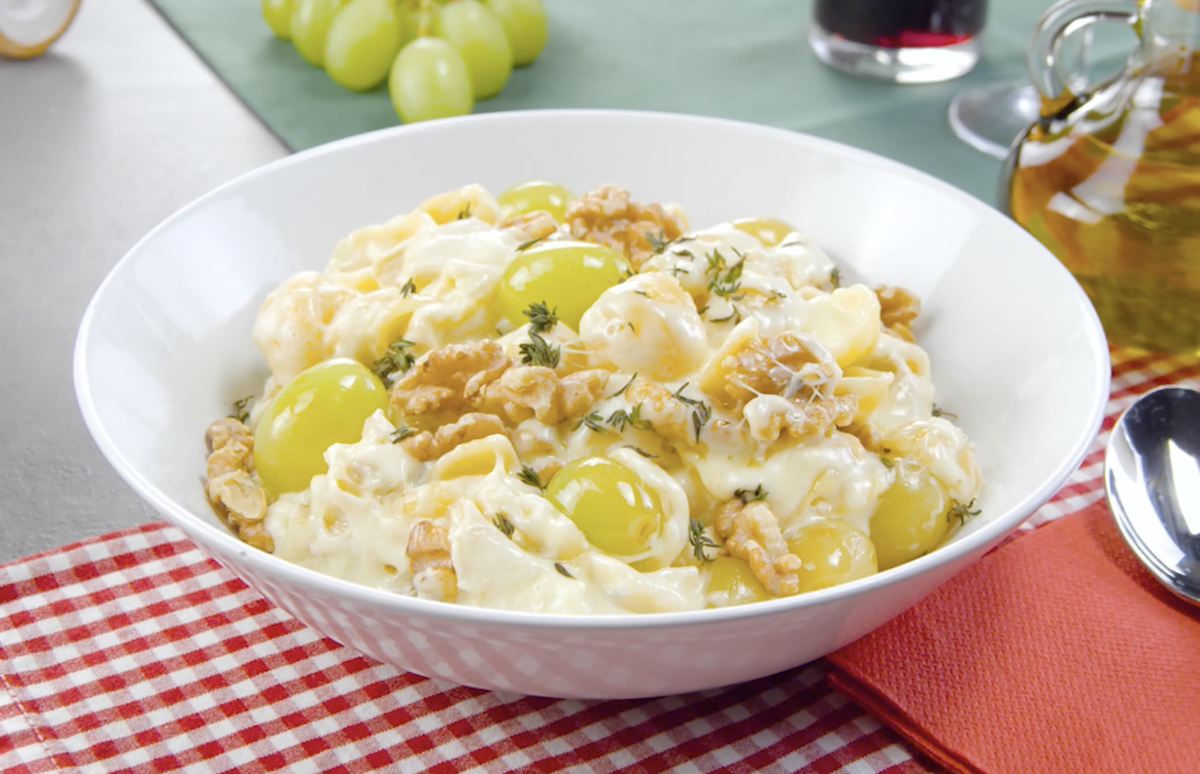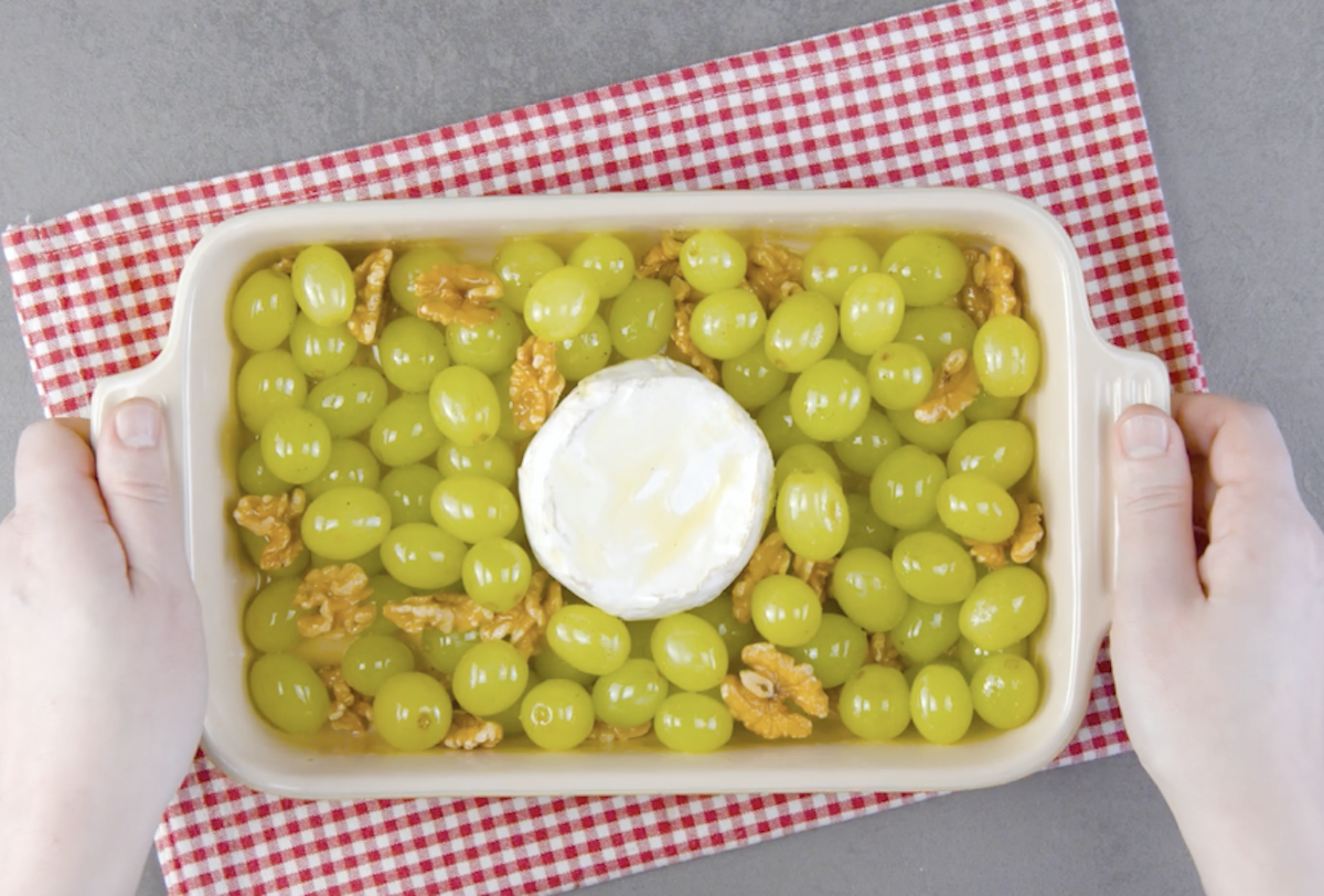 4.1 Lege einen Camembert in die Mitte einer Auflaufform. Verteile rundherum Weintrauben und Walnüsse. Benetze alles mit Olivenöl und würze mit Salz und Pfeffer. Schiebe die Form bei 200 °C Ober- und Unterhitze für etwa 25 Minuten in den Ofen. Bringe währenddessen die Pasta zum Kochen.