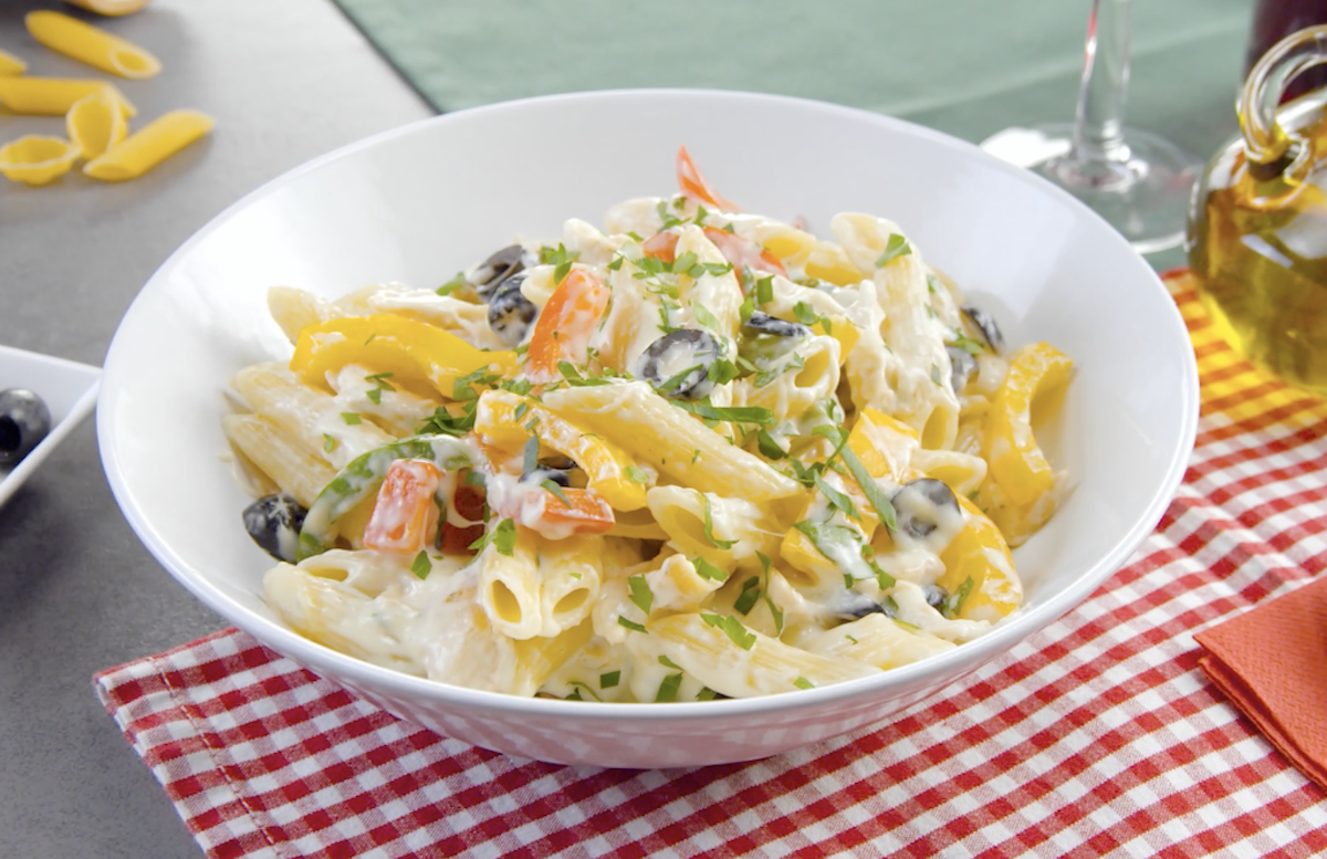 2.3 Nachdem du die Auflaufform aus dem Ofen geholt hast, fügst du noch kleingeschnittene Oliven und Petersilie hinzu. Vermenge alles und hebe zum Schluss die gekochten Penne unter.