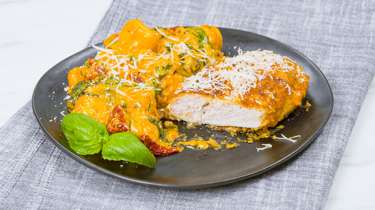 4. Zum Schluss kommen die Hähnchenbrüste mit in die Pfanne. Bestreue alles mit geriebenem Parmesan und serviere das leckere One-Pot-Gericht mit frischem Basilikum.