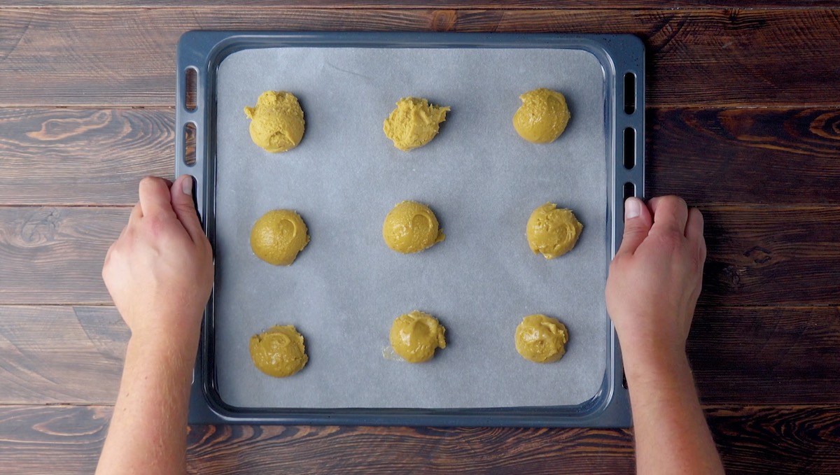 2.) Verteile den Teig danach mit Hilfe eines Eisportionierers – alternativ kannst du auch zwei große Löffel nehmen – in Kugelform auf einem Blech und backe die Kekse für 14 Minuten bei 180 °C im Umluft-Modus.
