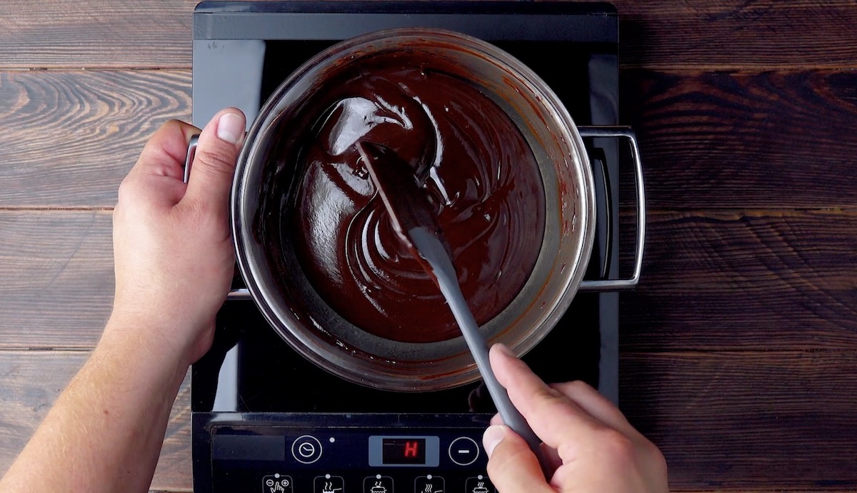 3.) Während die Kekse abkühlen, kannst du die Kuvertüre zusammen mit der Sahne im Wasserbad schmelzen und dabei immer wieder umrühren, sodass sich eine cremige Ganache bildet.
