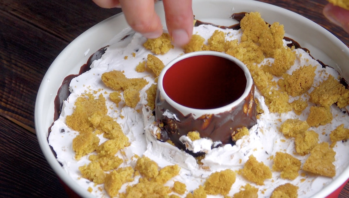 6.) Gib nun das Eis in die Form und streue weitere Kekskrümel obendrauf.