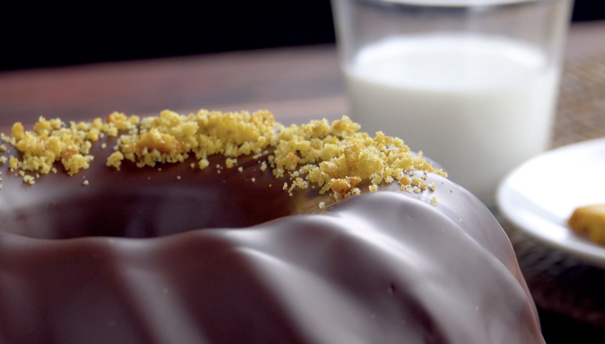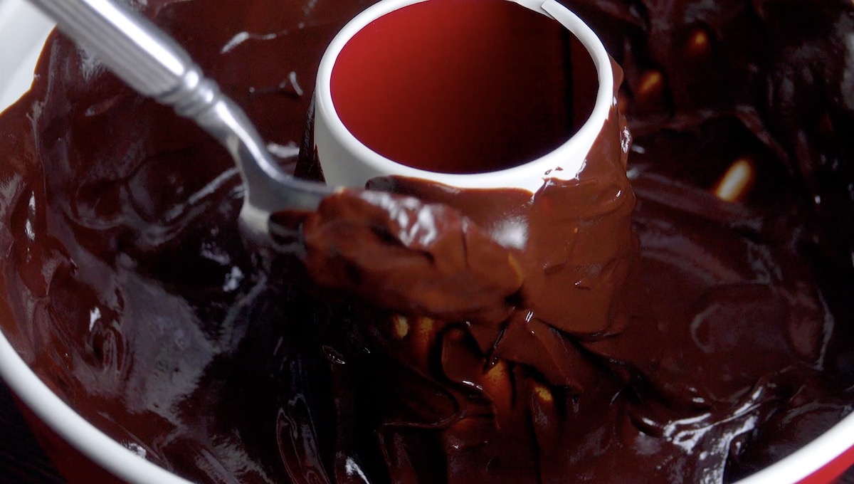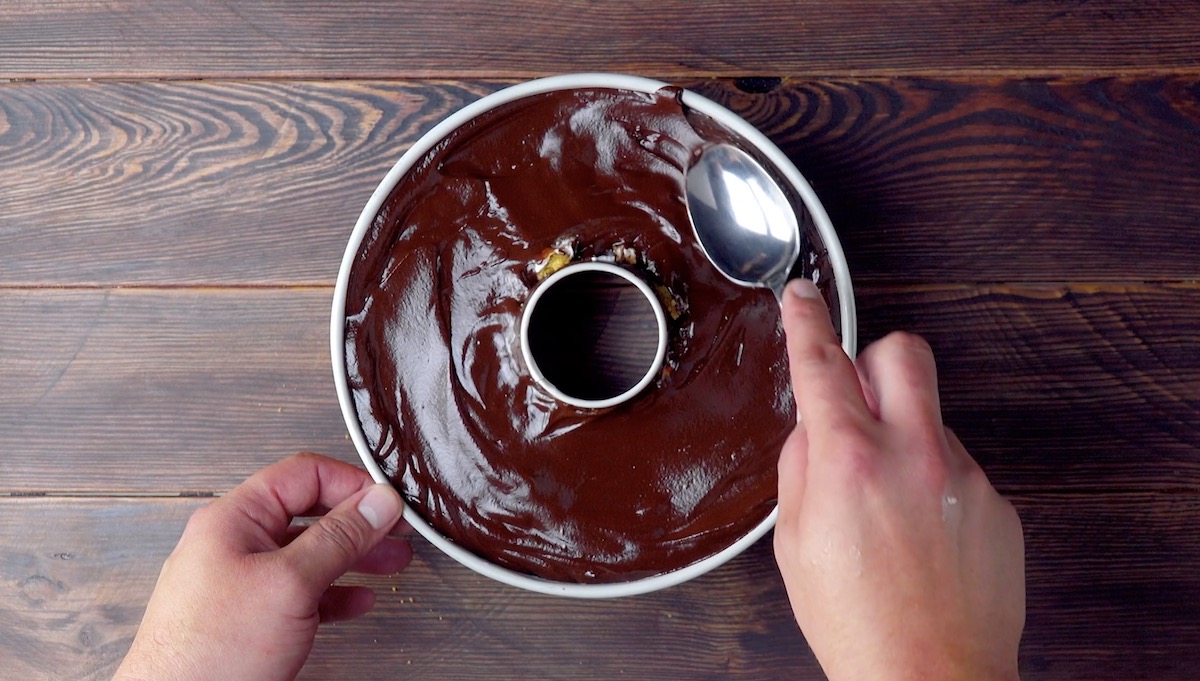 4.) Gieße nun etwa 3/4 der Ganache in die Gugelhupfform und verteile sie mit einem Löffel gleichmäßig an den Rändern und der Mitte.