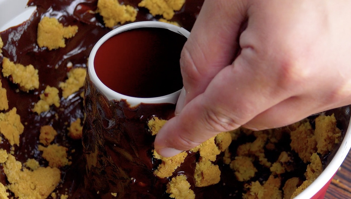 5.) Zerkleinere anschließend mit den Händen die abgekühlten Kekse und verteile den größeren Teil der Krümel in der Form.