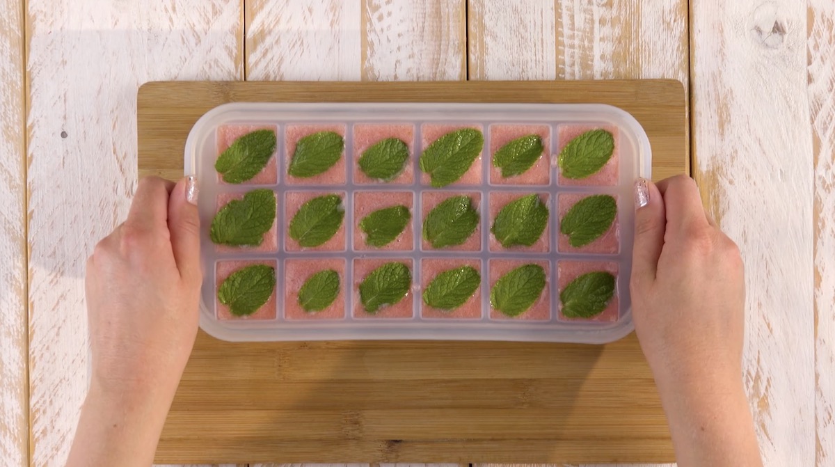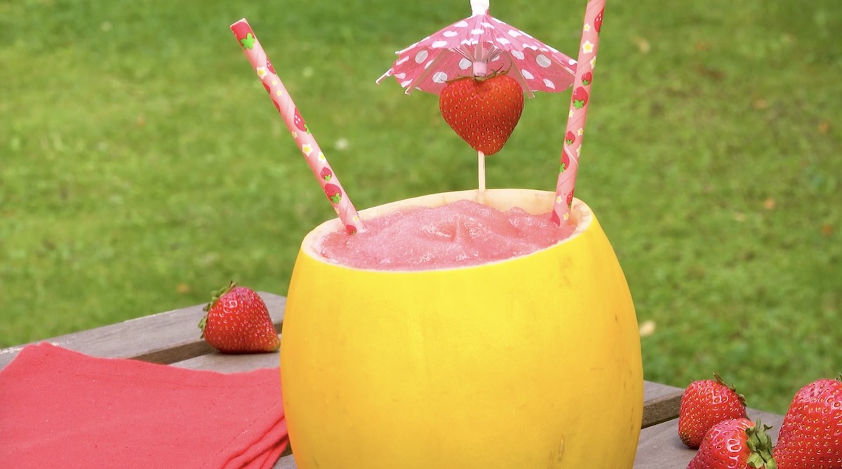 1.) Schneide eine dünne Scheibe von der Unterseite der Melone, damit diese aufrecht stehen bleibt. Von der Oberseite schneidest du eine so dicke Scheibe ab, dass du anschließend die Melone mit einem Löffel aushöhlen kannst. Entferne die Kerne und gib das Fruchtfleisch in einen Mixer. Gib außerdem Erdbeeren, Wodka und Honig dazu und mixe die Zutaten zu einer glatten Masse. Lass die Masse in eine große Eiswürfelform laufen. Auf jeden Würfel legst du zusätzlich jeweils ein Blatt Minze.