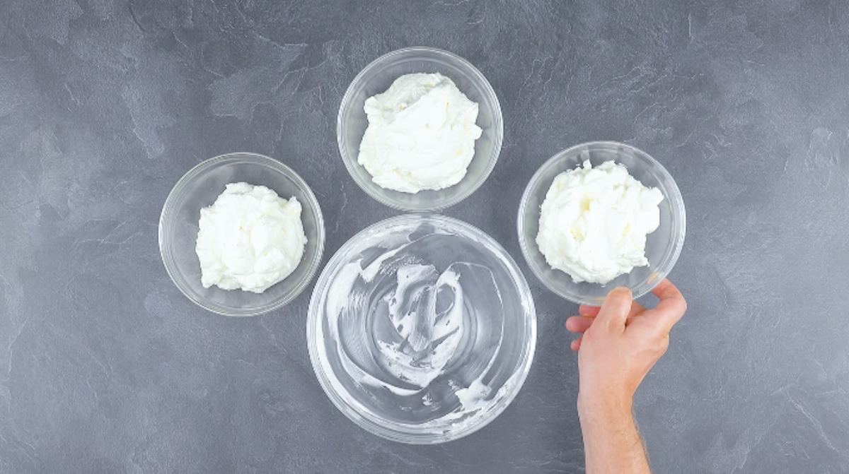 2. Bereite nun die einzelnen Eissorten zu. Verrühre die geschlagene Sahne (insgesamt 525 g) mit der gezuckerten Kondensmilch (insgesamt 150 g) und teile die Masse anschließend auf drei gleich große Schüsseln auf.