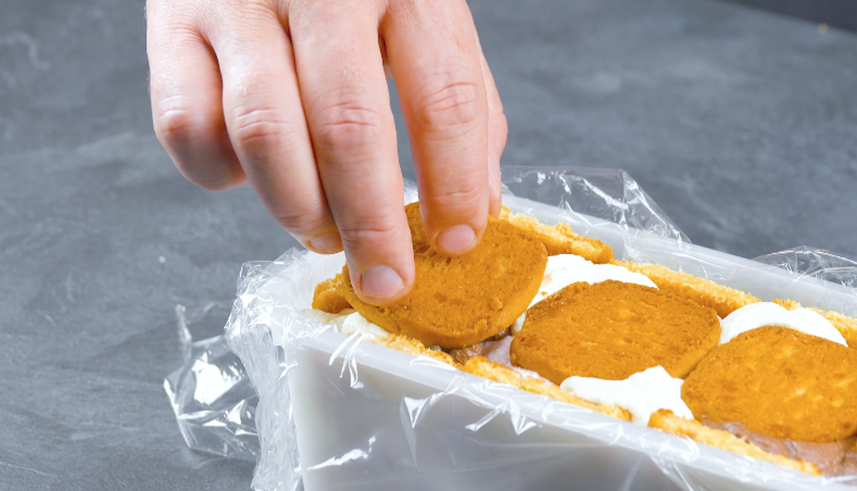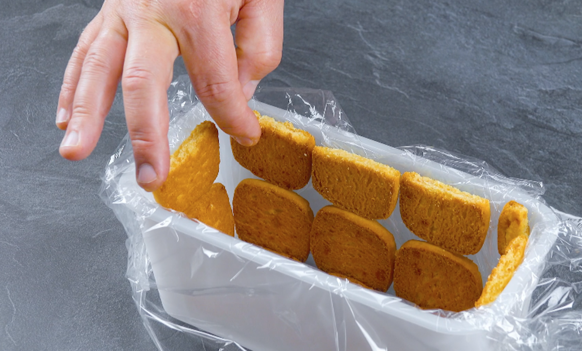 1. Kleide die Tupperdose mit Frischhaltefolie aus und lege sie anschließend auf dem Boden und am Rand mit Keksen aus.