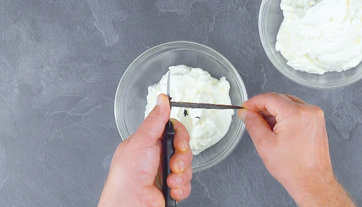 3. Gib in die erste der drei Schüsseln das Mark einer Vanilleschote hinzu und vermenge es mit der Sahne.