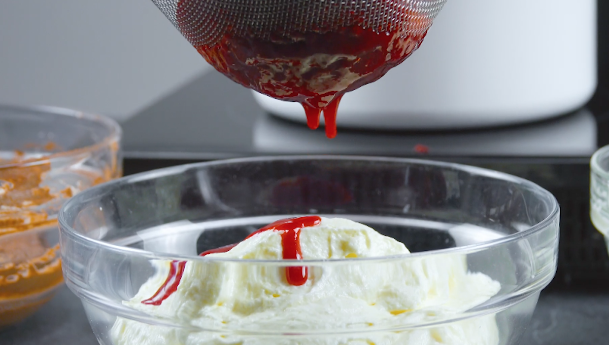 5. Koche gefrorene Himbeeren mit Zucker langsam in einem Topf auf und lasse alles ca. 5 Minuten köcheln. Püriere die Himbeeren und gib sie dann durch ein Sieb in die letzte der drei Schüsseln und vermenge alles miteinander.