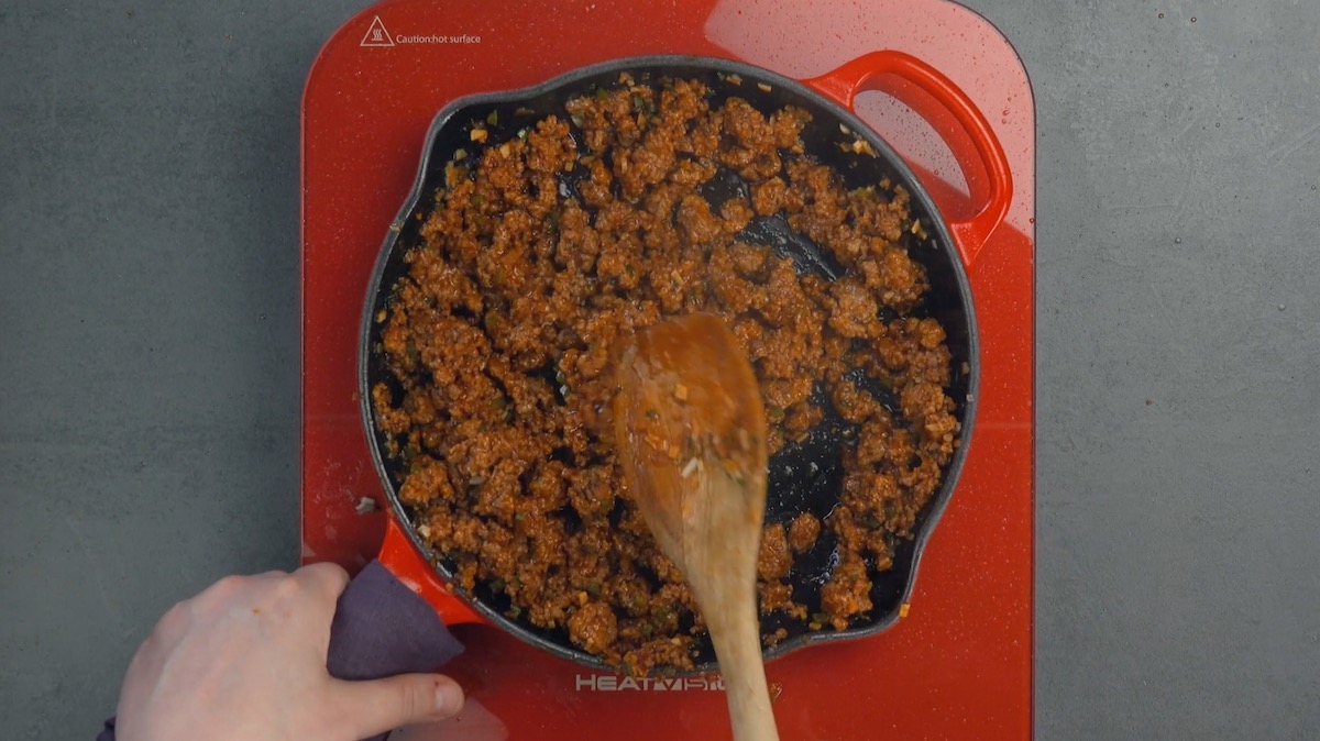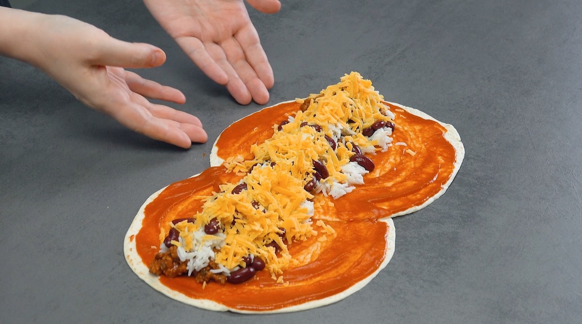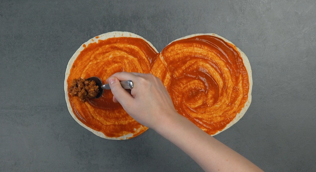 3. Lege je zwei Tortillas so nebeneinander, dass sie sich an einer Seite überlappen. Bestreiche die Tortillas dann mit Soße und richtige das Hackfleisch mittig in einer Linie darauf an.