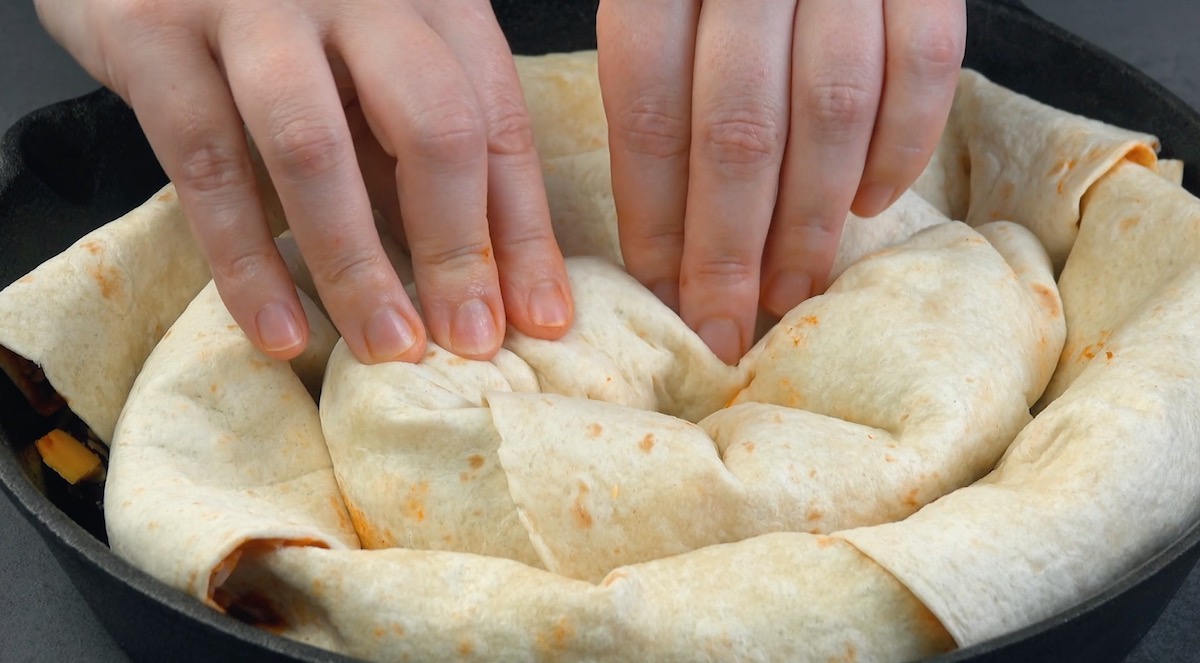 5. Rolle die belegten Tortillas vorsichtig zusammen und lege alle vier Rollen in eine gusseiserne Pfanne oder eine Auflaufform.