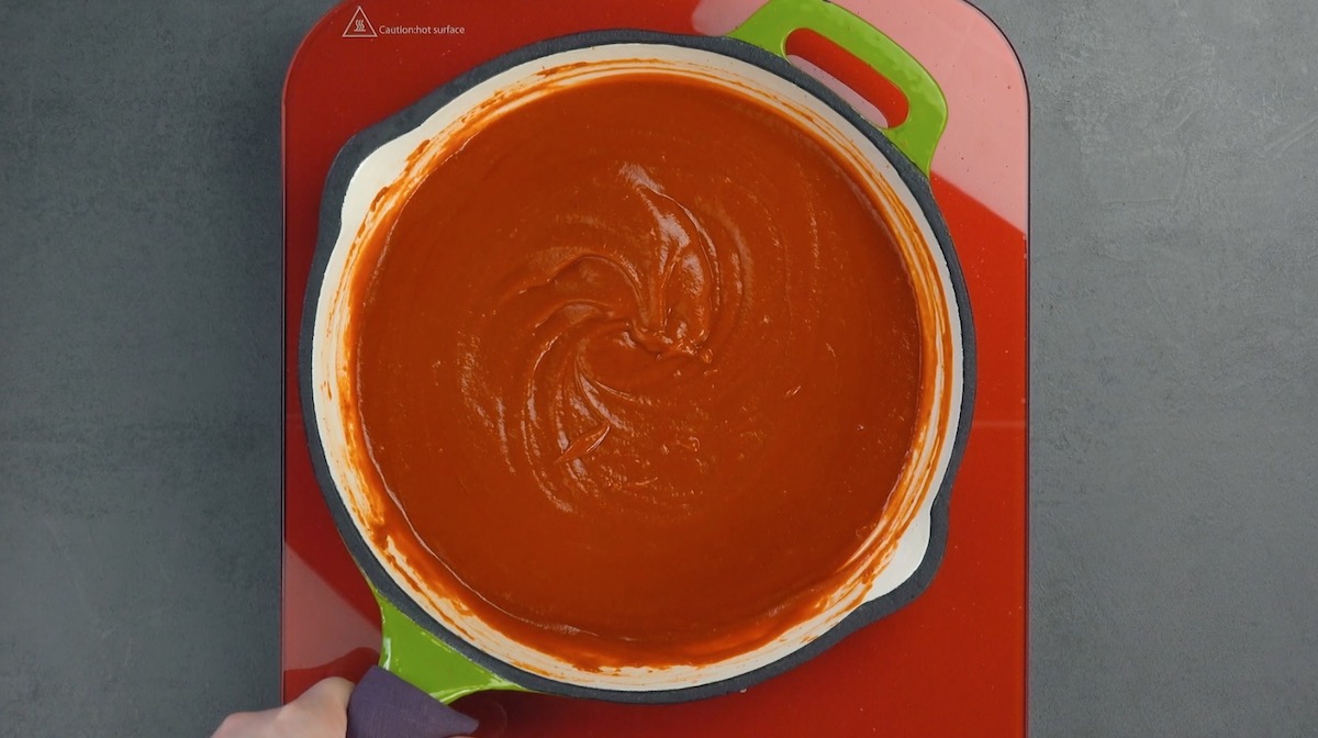 1. Schmilz für die Soße Butter in einer Pfanne, rühre Mehl hinzu und lösche die Mehlschwitze dann mit Tomatensoße und Gemüsebrühe ab. Würze die Soße anschließend mit Paprikapulver, Koriander, Pfeffer und Chilisoße.