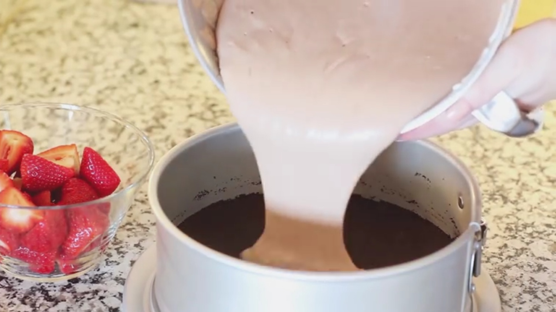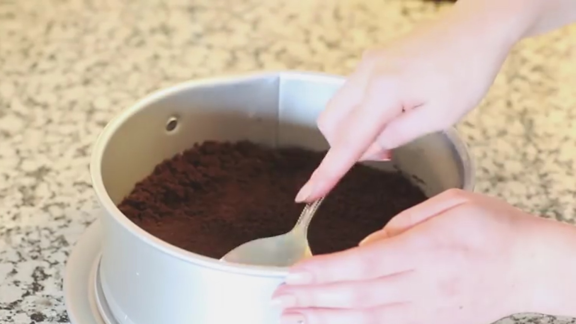 Drücke die Krümelmischung auf den Boden einer Springform. Mit der Löffelrückseite kannst du die Krümel schön festdrücken. Wenn du willst, kannst du den Boden bei 180°C für 10 Minuten backen, dann hält er noch besser zusammen. Du musst ihn aber nicht backen!