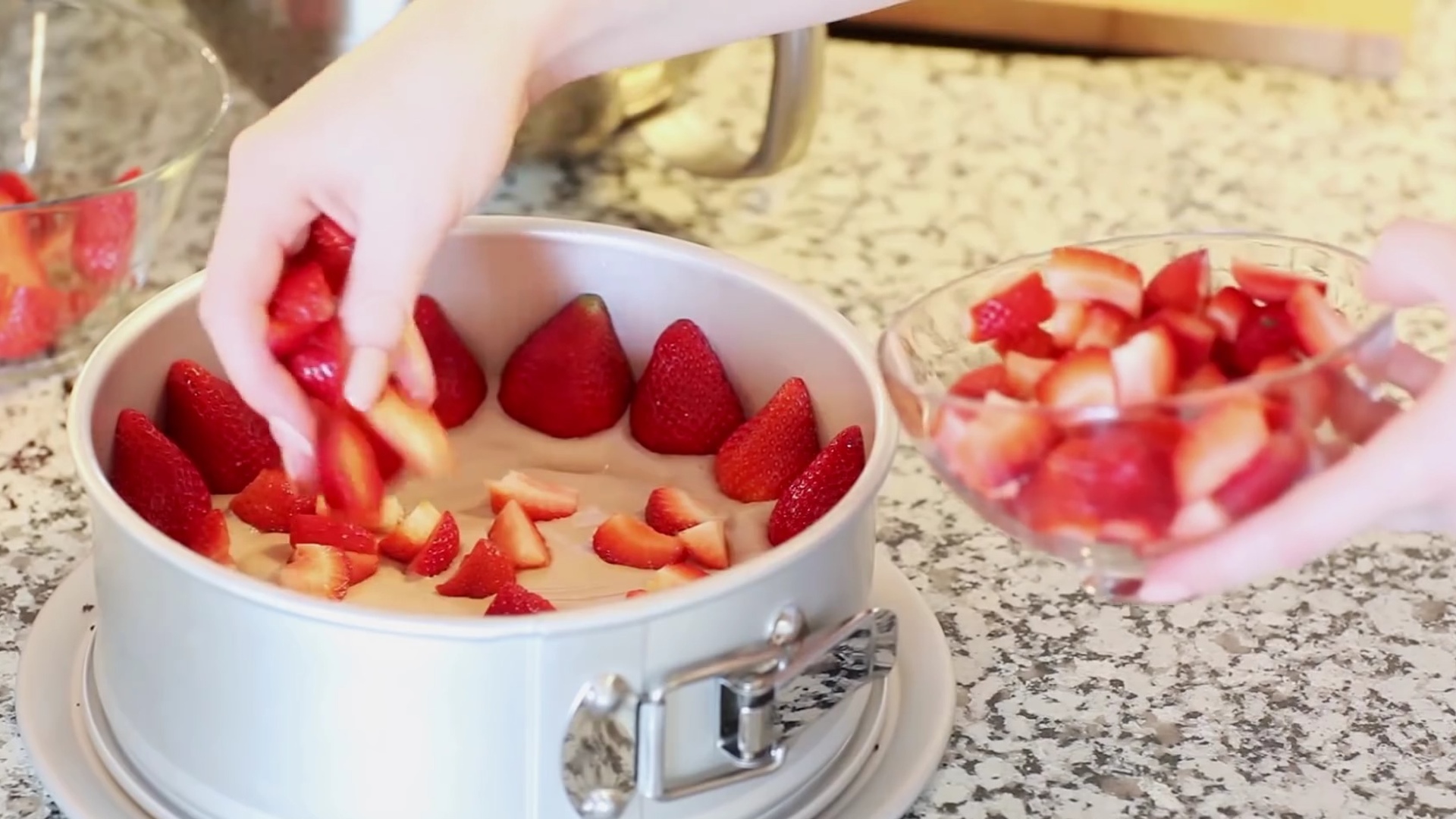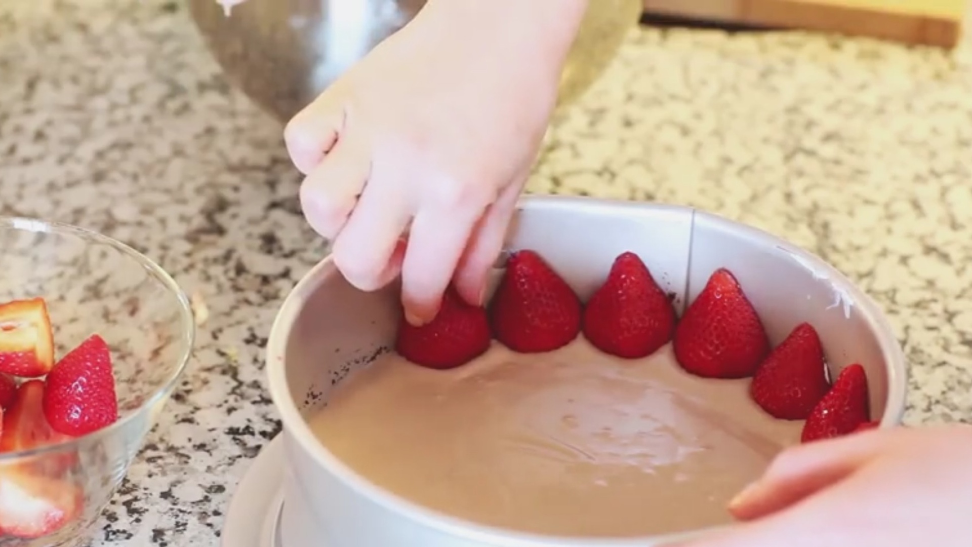Halbiere Erdbeeren und stelle sie mit dem Kopf nach unten außen herum in die Creme.