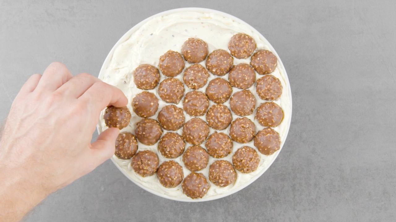 5. Verteile anschließend die restliche Mascarponecreme gleichmäßig obendrauf und verstreiche sie vorsichtig. Drücke zum Schluss die Rocher-Kugeln leicht in die Creme und lass den gesamten Kuchen für mindestens 4 Stunden, besser noch über Nacht, gut durchkühlen.