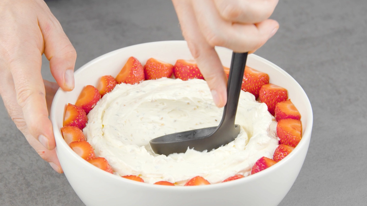 3. Fülle nun drei Viertel der Creme in die mit den Früchten ausgelegte Schüssel und drücke mit einer Kelle oder Ähnlichem in der Mitte eine Mulde hinein. Stelle die Schüssel danach für etwa eine Stunde in den Kühlschrank.