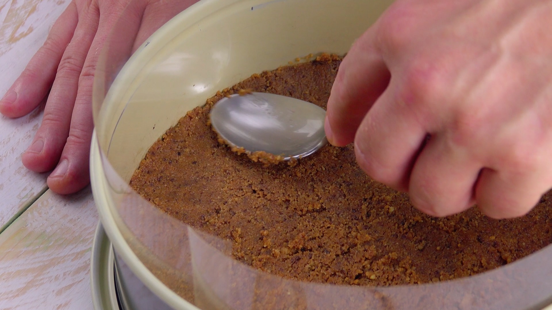 1.) Zerkrümele zunächst die Kekse und vermische sie mit einem Löffel mit der flüssigen Butter. Kleide anschließend eine Springform (Durchmesser: 24 cm) mit einem breiten Streifen Klarsichtfolie oder Tortenrandfolie aus. Verteile anschließend die Krümel auf dem Boden der Form und drücke sie mit dem Löffelrücken fest.