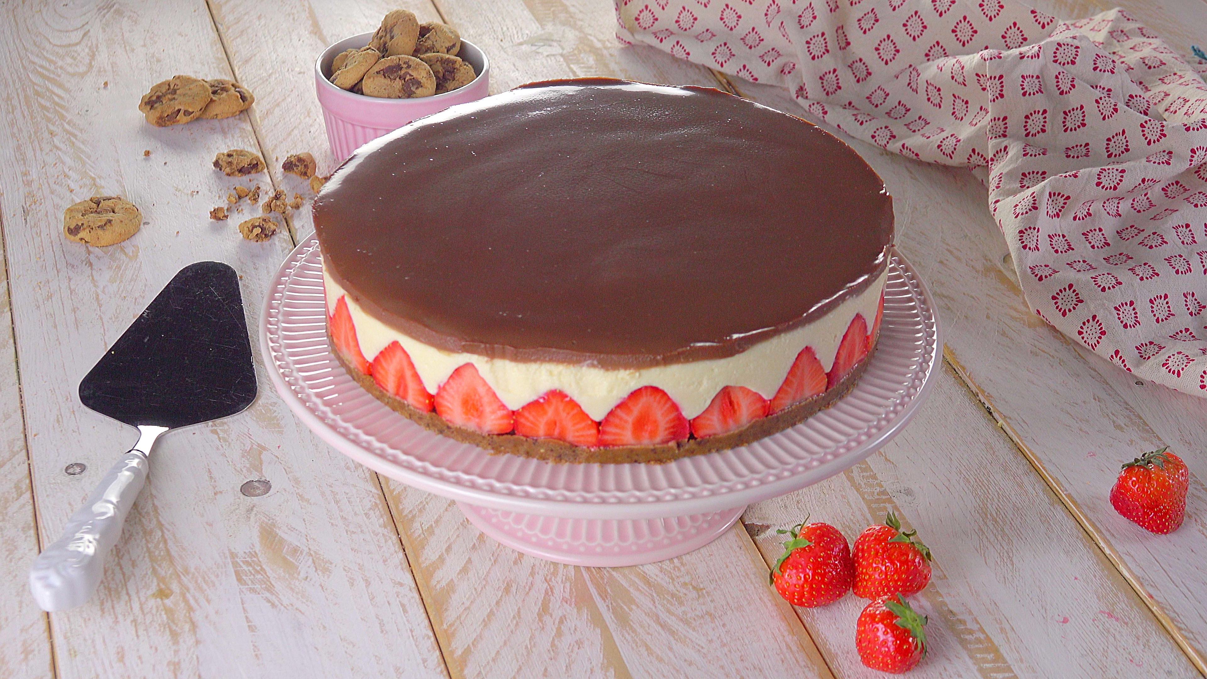 6.) Gieße die Schokoglasur über den Kuchen und stelle die Form noch einmal kalt, damit die oberste Schicht fest werden kann. Entferne vor dem Servieren noch die Tortenrandfolie und voilà: Fertig ist der Erdbeertraum!