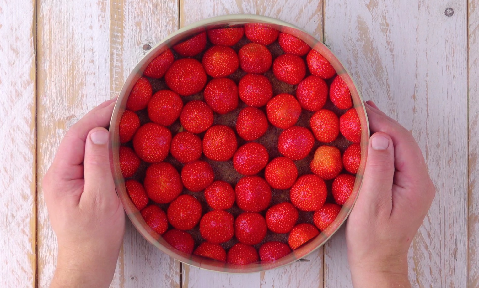 2.) Entferne nun den Strunk der gewaschenen Erdbeeren und halbiere so viele, dass du den Tortenrand vollständig mit ihnen auskleiden bzw. umrunden kannst. Lege den Rest der Form mit den ganzen Erdbeeren mit der Strunkseite nach unten aus.
