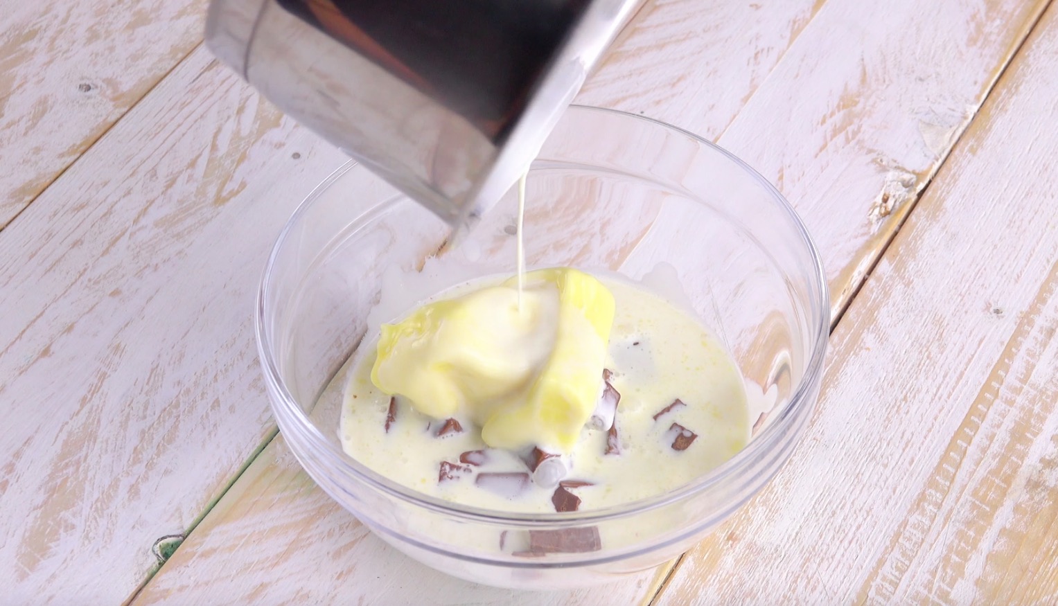 5.) Gib für die Glasur zunächst die gehackte Schokolade und die Butter in eine Schüssel. Lass dann die Sahne aufkochen und gieße sie über diese Mischung. Warte kurz, damit Schokolade und Butter flüssig werden können, und rühre nun alles mit einem Schneebesen zu einer glatten Soße.