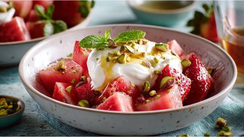 Die Zubereitung dieses sommerlichen Frühstücks ist so einfach, dass es dafür eigentlich nicht mal ein Rezept bräuchte. Du schneidest die Früchte einfach klein, gibst sie in eine Schüssel, träufelst etwas Zitronensaft darüber und gibst den Joghurt dazu. Noch etwas flüssigen Honig und gehackte Pistazien obendrauf – fertig in nur zehn Minuten.