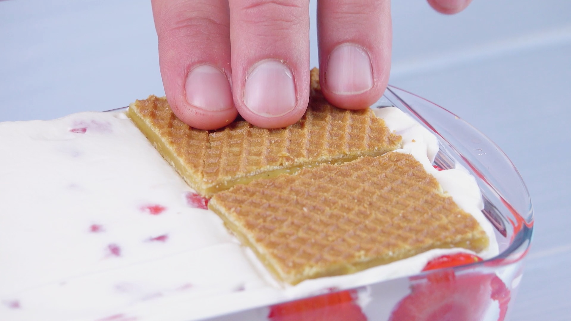 5.) Schneide jede der acht Honigwaffeln zu einem Quadrat und lege sie oben auf die Creme. Abschließend stellst du die Form mit dem süßen Inhalt für 4 Stunden in den Tiefkühlschrank.