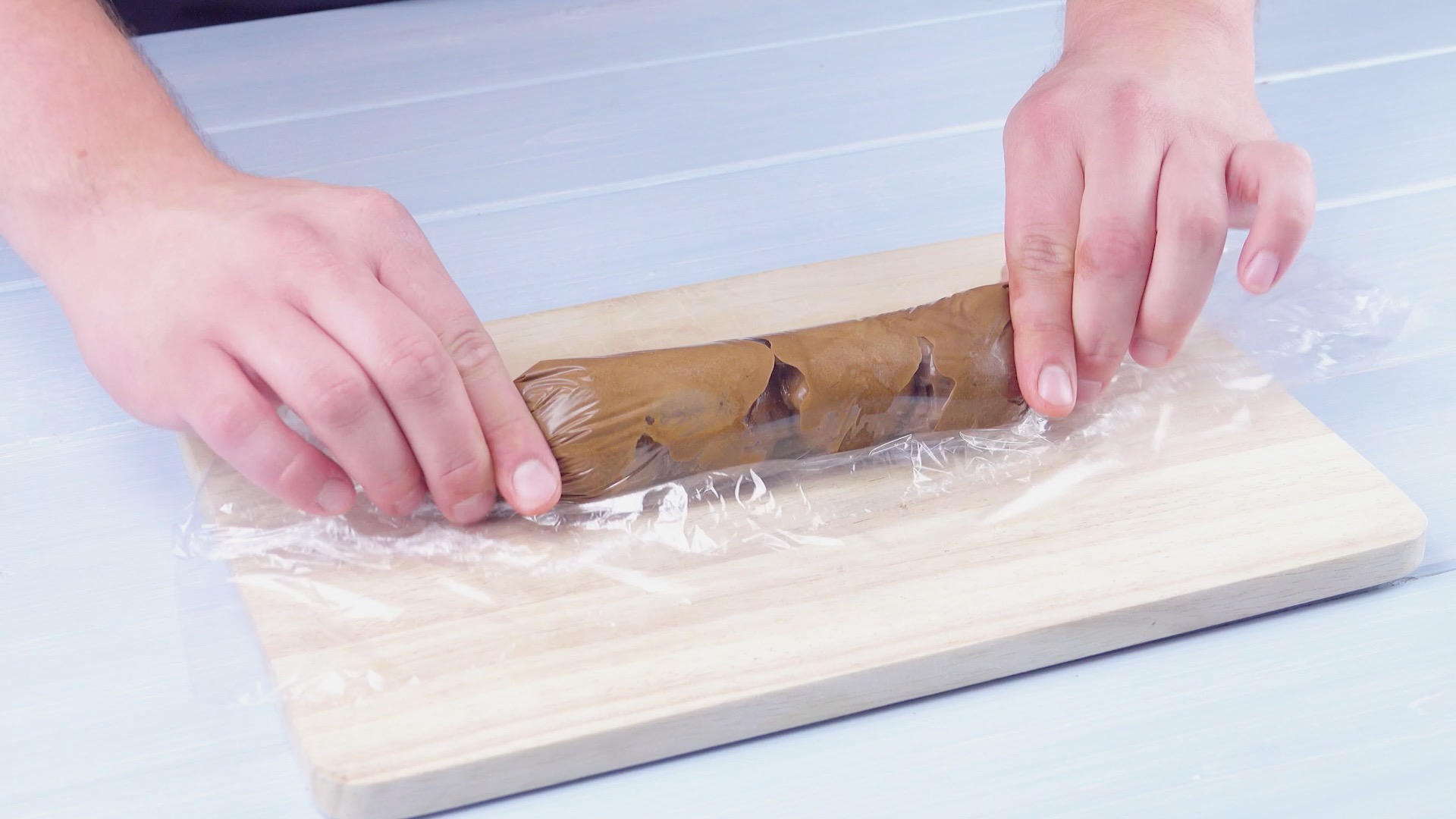 3.) Lege 4 Kugeln Schokoladeneis nebeneinander auf Klarsichtfolie. Wickle die Folie um das Eis und forme die Kugeln zu einer Wurst, die du dann für eine Stunde ins Gefrierfach legst.