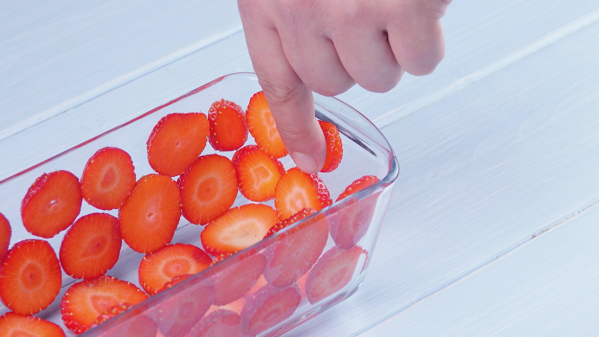 1.) Befreie die Erdbeeren vom Strunk und schneide ausreichend Früchte in Scheiben, um damit das Innere der Auflaufform auszukleiden.