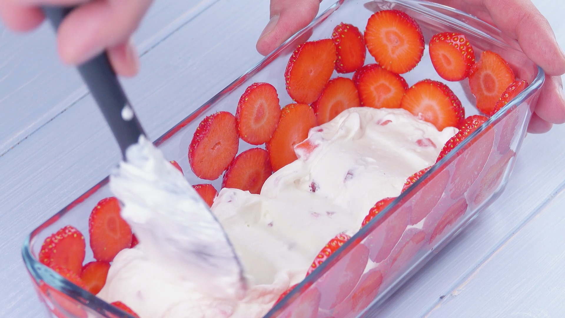 Gib etwa ein Drittel der Creme in die mit Erdbeeren ausgekleidete Glasform und bedecke damit den Boden.