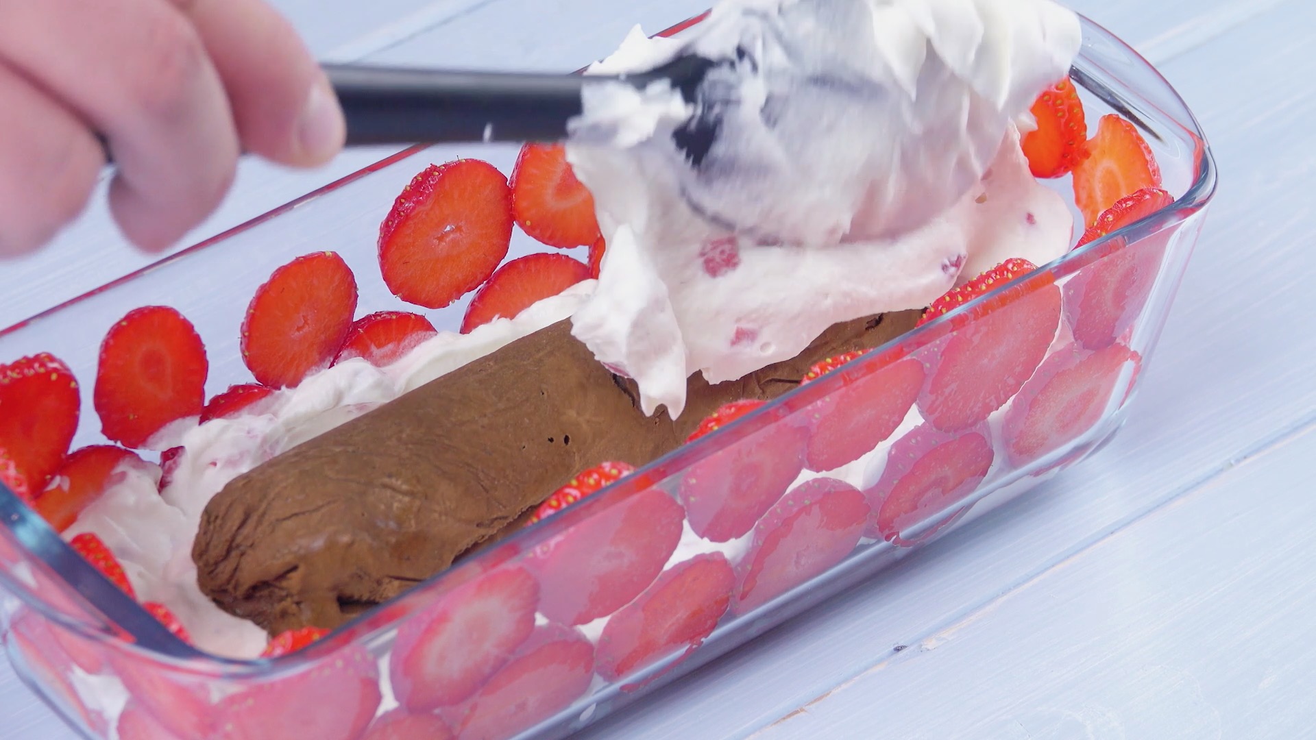 4.) Wickle das gefrorene Schokoladeneis aus und drücke es in die bereits verteilte Creme in der Auflaufform. Gib anschließend die restliche Creme darauf und streiche sie glatt.